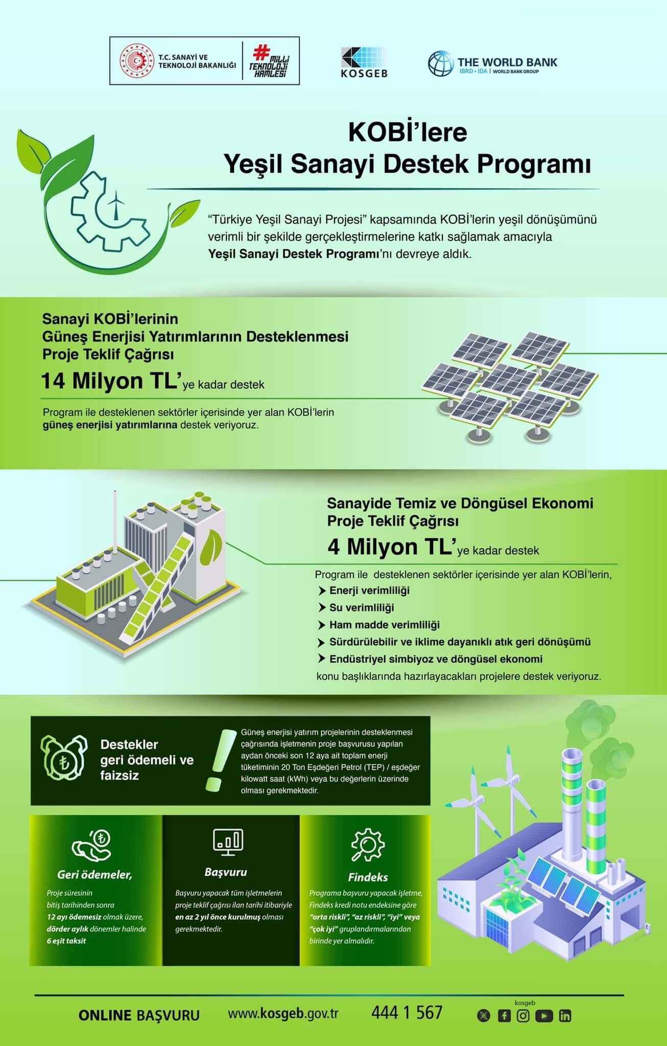 KOSGEB ve Dünya Bankası iş birliği ile yürütülecek olan “Türkiye Yeşil Sanayi Projesi” kapsamında, küçük ve orta ölçekli işletmelerin yeşil dönüşümünü verimli bir şekilde gerçekleştirmelerine katkı sağlamak amacıyla hazırlanan Yeşil Sanayi Destek Programı’nın devreye alındığını duyurdu.